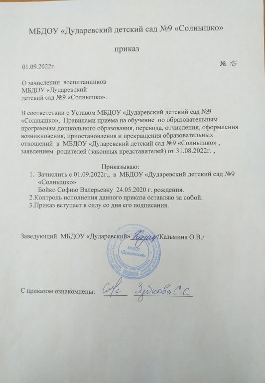 Распорядительный акт о зачислении ребенка в образовательную организацию